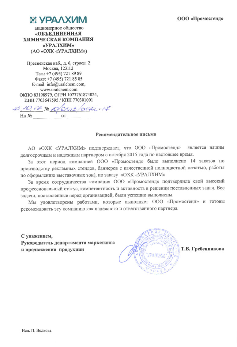 Вот фотографии прошлой выполненной работы (оформление выставочной зоны) и рекомендательное письмо от АО "ОХК "Уралхим" АО "ОХК "УРАЛХИМ" | ||